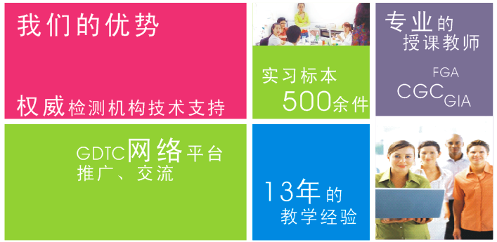 彩色宝石鉴定课程班、钻石分级课程班,翡翠鉴定与商贸课程班等培训课程已经十几年的经验。培训班对学员的实际操作技能进行严格训练,在课程中学员可观察到大量标本,通过理论与实践结合学习,使学员真正掌握所学知识,深受学员好评,取得了良好的社会效应。