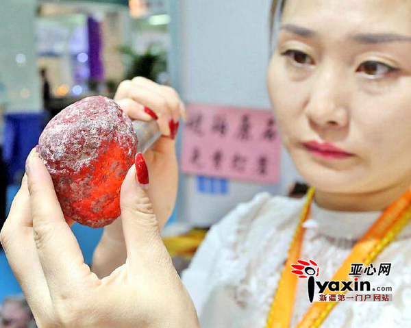 8月12日,在2015亚欧商品贸易博览会珠宝玉器工艺品精品展馆内,一位商家正在展示血珀原石。亚心网记者李雄心摄