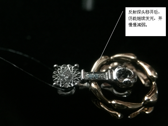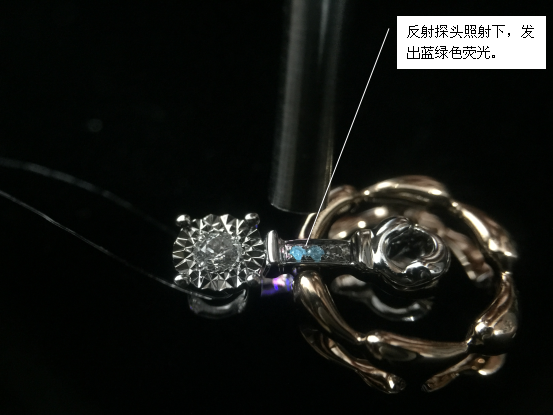近期在使用紫外-可见光纤光谱仪对样品进行日常鉴定的过程中,发现配镶的厘石碎钻中有两颗的荧光极强。而且,当反射探头离开样品的时候,出现了明显的磷光现象,这点非常符合无色HPHT合成钻石的特征。通过近一步的检测确认这两粒配石就是HPHT合成钻石。